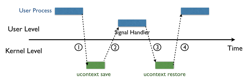 内核会为该进程保存相应的上下文,将当前的信息压入栈中(栈寄存器等),以及将 sigreturn系统调用地址压入栈中。需要注意的是,这一部分是在用户进程的地址空间的。之后会跳转到注册过的 signal handler 中处理相应的 signal。因此,当 signal handler 执行完之后,就会执行 sigreturn 代码。