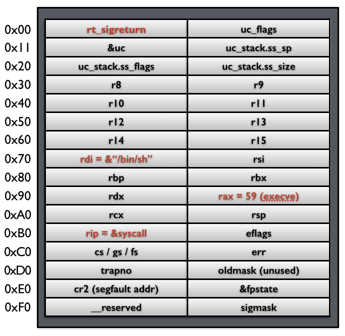 1 2 3 4 5 6 7 8 9 10 11 12 13 14 15 16 17 18 19 20 21 22 23 24 25 26 27 28 29 30 31 32 33 34 35 36 37 38 39 40 41 42 43 44 45 46 47 48 49 50 51 52 53 54 55 56 57 typedef struct ucontext_t { unsigned long int uc_flags; struct ucontext_t *uc_link ; stack_t uc_stack; mcontext_t uc_mcontext; sigset_t uc_sigmask; struct _libc_fpstate __fpregs_mem ; } ucontext_t ; typedef struct { void *ss_sp; size_t ss_size; int ss_flags; } stack_t ; struct sigcontext { __uint64_t r8; __uint64_t r9; __uint64_t r10; __uint64_t r11; __uint64_t r12; __uint64_t r13; __uint64_t r14; __uint64_t r15; __uint64_t rdi; __uint64_t rsi; __uint64_t rbp; __uint64_t rbx; __uint64_t rdx; __uint64_t rax; __uint64_t rcx; __uint64_t rsp; __uint64_t rip; __uint64_t eflags; unsigned short cs; unsigned short gs; unsigned short fs; unsigned short __pad0; __uint64_t err; __uint64_t trapno; __uint64_t oldmask; __uint64_t cr2; __extension__ union { struct _fpstate * fpstate ; __uint64_t __fpstate_word; }; __uint64_t __reserved1 [8 ]; };