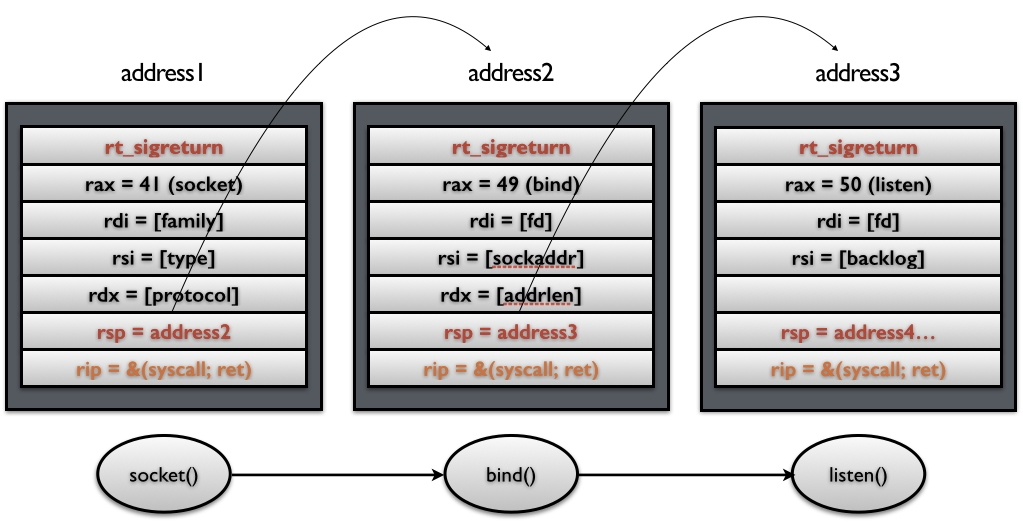 由于Signal Frame是在用户态的栈中,因此若在栈中伪造Signal Frame,同时调sigreturn系统调用,即可实现对所有寄存器的控制包括rip,从而实现攻击。