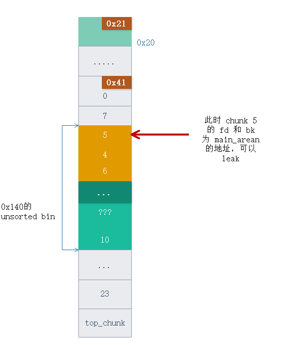 - 首先 释放 chunk 7 , 它会进入 unsorted bin, 设它为 C .