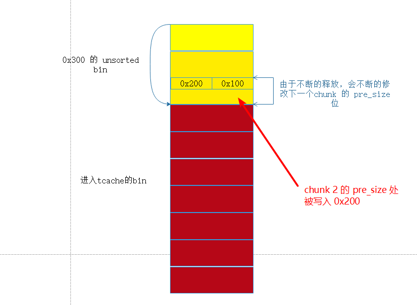 首先分配 10 个 chunk , 释放掉后面 7 个这7 个进入 tcache , 然后释放 前面 3 个,这3 个会进入 unsorted bin , 这个过程会在 chunk 2 的 pre_size 写入 0x200.