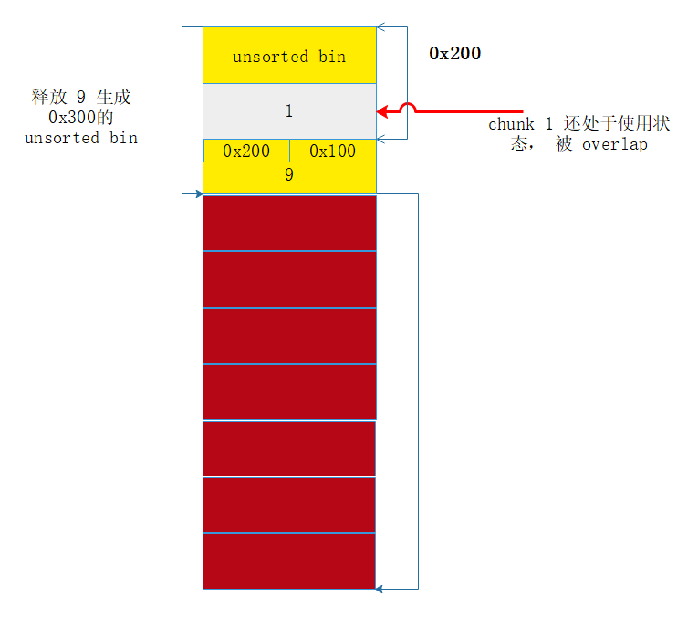 - 然后释放 chunk 9 , 由于 pre_size 和 pre_inused ,系统会找到 C , 然后把 C unlink , 由于此时 C 在 unsorted bin 链表上,会 正常 unlink , 之后形成一个 0x300 的 unsorted bin , 里面包含了 还在使用状态的 B