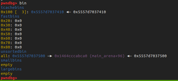 1 | # 把剩下的 tcache 里面的 bin 消耗掉 |