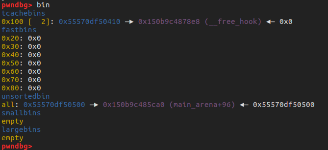 # 此时 tcache 中为两个 一样的 chunk 链在了一起, 设这个 chunk 的名称为 A。