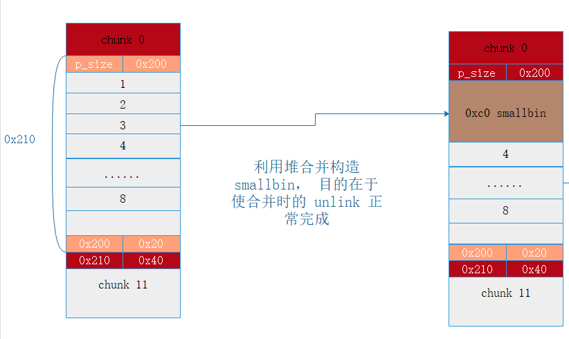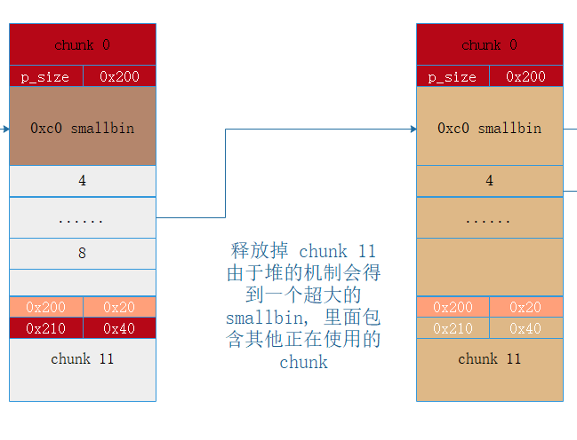 系统发现 chunk 11 的 pre_size 为 0 ,即表明前一个 chunk 是释放状态,同时 chunk 11 和 top_chunk 相邻,所以 即使 chunk 11 的大小在 fastbin 的范围内也会触发合并操作,于是会通过 chunk 11 的 pre_size ( 0x210 ) 找到上面那个 smallbin 的起始地址。