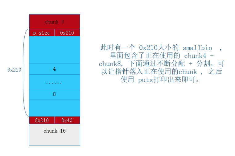 紧接着在这个剩下的 0x200 字节的 smallbin 里面分配 8 个 chunk , 然后利用同样的方法,在里面构造一个 smallbin