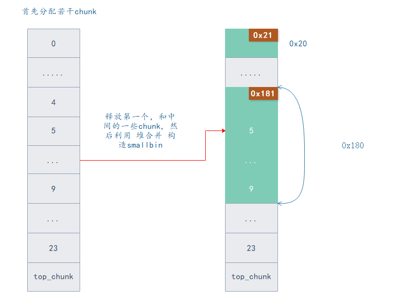 这个 chunk 会继续和 top_chunk 合并变成 top_chunk 的一部分。注意到此时 chunk4 - chunk8 已经落入 top_chunk 里。