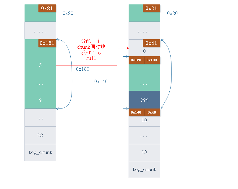 首先分配 12 个 chunk, 其中 第一个 和最后一个保留, 第一个 chunk 用于 触发 off-by-null , 最后一个用于防止在 堆合并时与 top_chunk 进行合并。