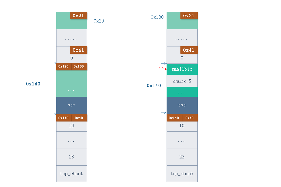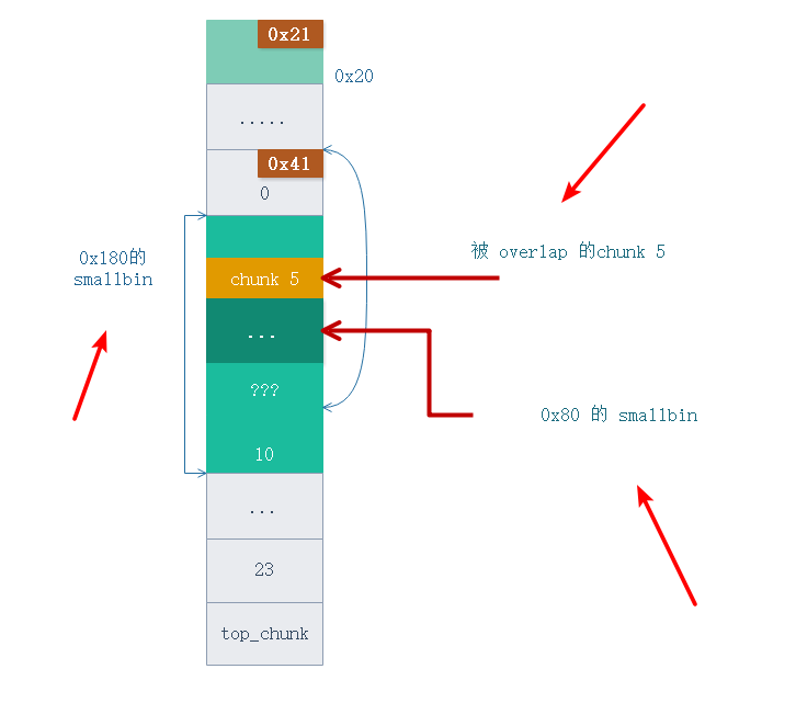 然后把 chunk 10 释放掉, 此时系统根据 chunk 10 的 pre_size 找到 smallbin 的位置进行合并, 由于 smallbin 此时已经在链表中,所以可以成功完成合并过程中的 unlink 操作, 然后会得到一个很大的 smallbin