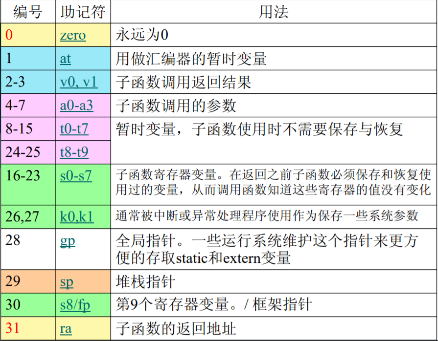 寄存器表示可以有两种方式: 1.直接使用该寄存器对应的编号,例如:从$0到$31 2.使用对应的寄存器名称,例如t1,t1,sp,详见下文